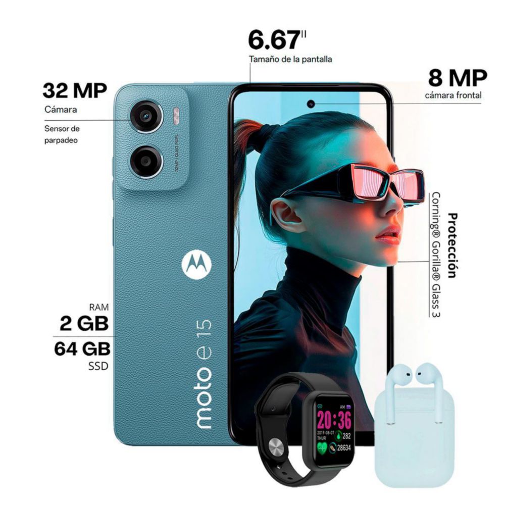 Celular Moto e15 64GB 2GB Ram Dual sim Misty Blue, Smartwatch +Audífono inalámbrico$1,999